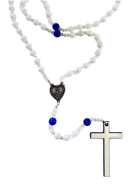 50 cm, croix en métal émaillé, grains en plastique avec médaille au centre. Se récite comme les autres.