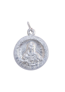 En métal blanc. Texte "O Vierge Sainte qui avez écrasé la tête du serpent, gardez notre foi et l'innocence de nos petits enfants" (M.J.J). Texte gravé en français