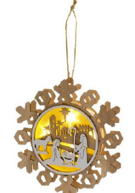 Nativité lumineuse en bois en forme de flocon neige à suspendre